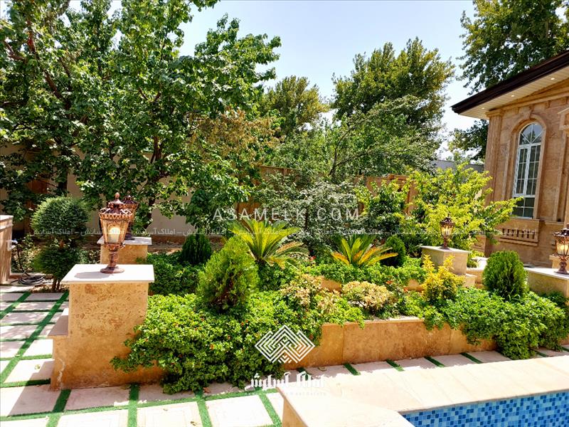 فضاسازی دلنواز و جذاب با استفاده از درختانمثمر ، کفسازی واشبتن و انواع درختچه های زینتی + نورپردازی شیک در کل باغویلا